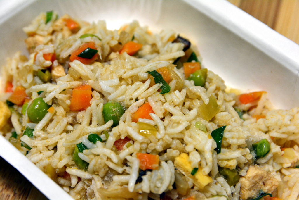 Ingredients: Rice, lean chicken breast fillet, carrots, onions, eggs, peas, vegetable oil, sesame oil, soy sauce (GF), shallots, garlic, ginger, sugar, vinegar, salt, pepper, spices.
